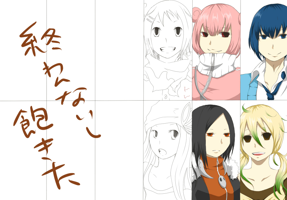 右上の彼が1番気合い入ってて、4番目の黒髪の彼女が雑な仕事ぶりになったのでここいらで一度打ち切らんと、もうマズイ。